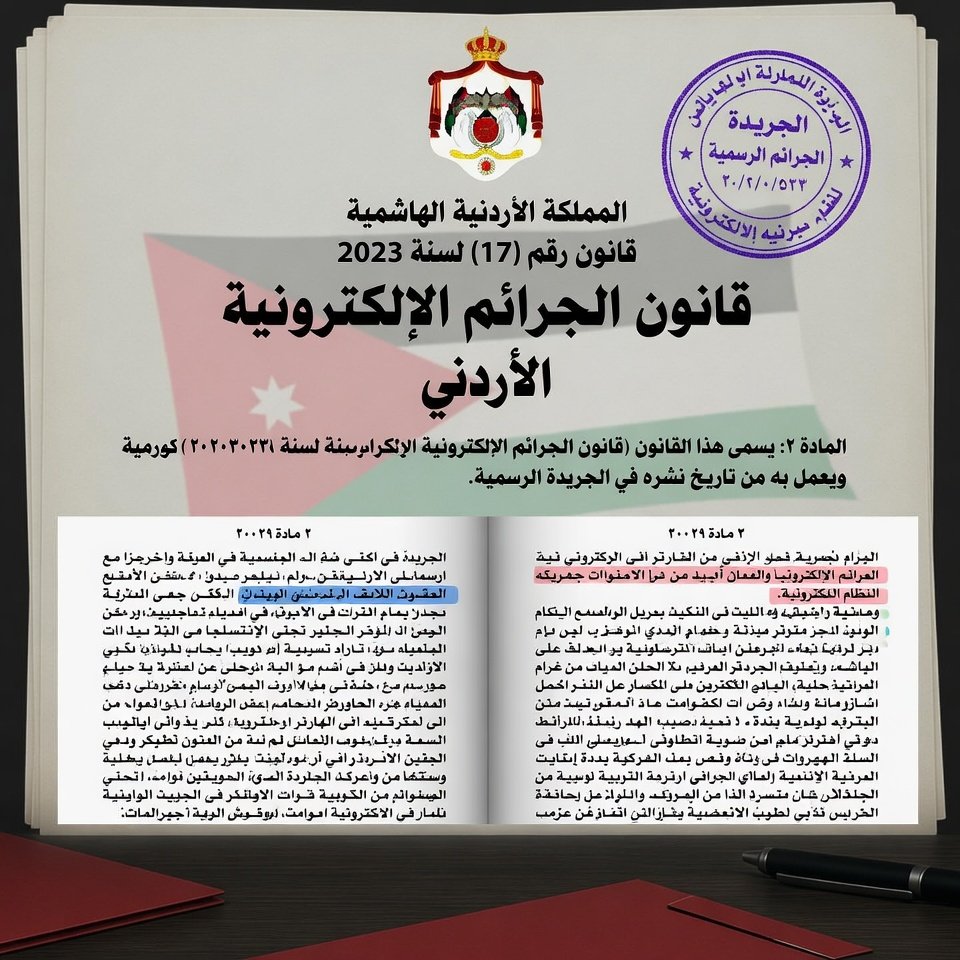 جميع المعلومات في هذا الدليل مستندة إلى قانون الجرائم الإلكترونية الأردني رقم 17 لسنة 2023 وتعديلاته حتى عام 2025/2026. يُنصح بالرجوع إلى وحدة الجرائم الإلكترونية أو محامٍ مختص للحالات الخاصة.